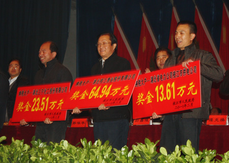 枝江酒業(yè)總經(jīng)理張春雷(右二)上臺接受頒獎 在2月27日召開(kāi)的枝江市三級干部會(huì )議上,枝江酒業(yè)獲得四項獎勵。一是獲得2009年度“納稅大戶(hù)…