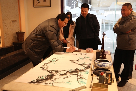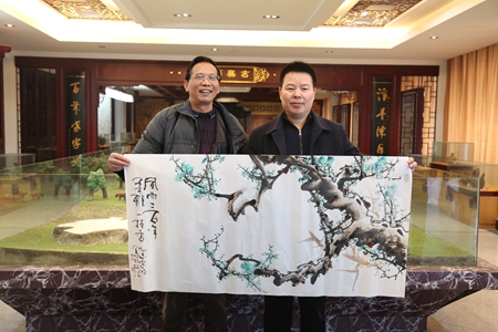 1月28日,國家一級美術(shù)師彭宗明到枝江酒業(yè)采風(fēng)。在枝江酒業(yè)銷(xiāo)售總經(jīng)理侯先圣的陪同下參觀(guān)了歷史文化展廳、釀造五車(chē)間、包裝三車(chē)間,對枝江酒業(yè)的歷史文化和獨特的釀造技藝表現出濃厚的興趣。在枝江酒業(yè)展廳,彭宗明現場(chǎng)揮毫潑墨,即興創(chuàng )作了“風(fēng)雨兩百年,柔雅一枝香”、“百年枝江,香滿(mǎn)乾坤”兩幅畫(huà)作。